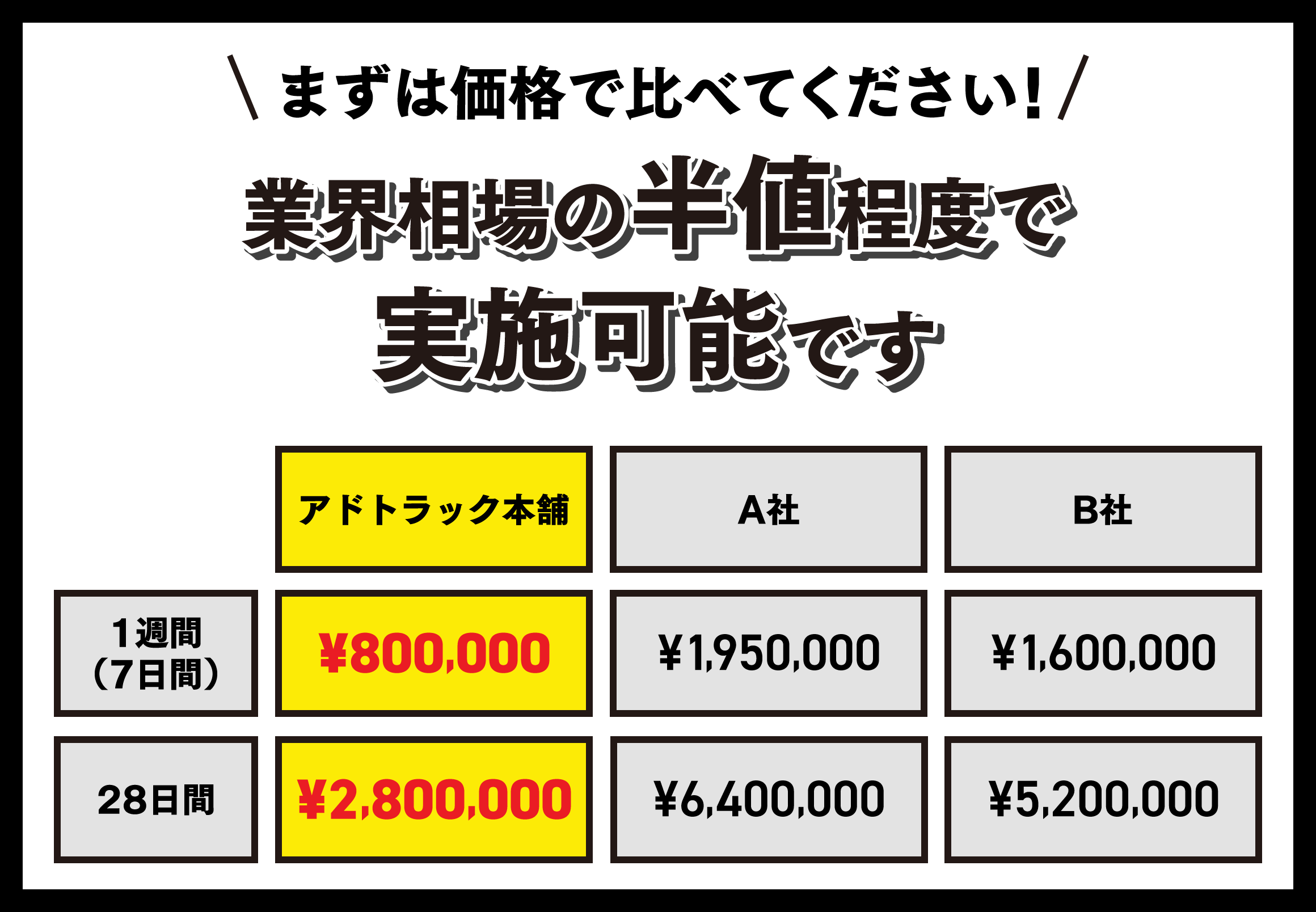 業界相場の約半額となる「1週間80万円 」という驚きのプライスを実現しました。