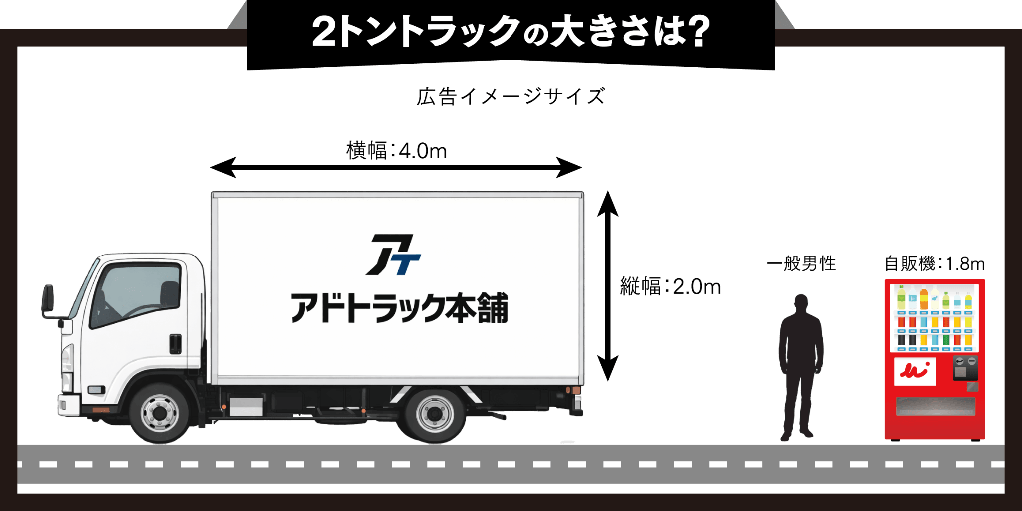 「2トンだと小さくて目立たないのでは?」と思われるかもしれませんが、ご安心ください。広告面は横幅4.0m×縦幅2.0mあり、街中で見かける自動販売機(高さ約1.8m)よりもさらに大きく、歩行者への視認性は抜群です。